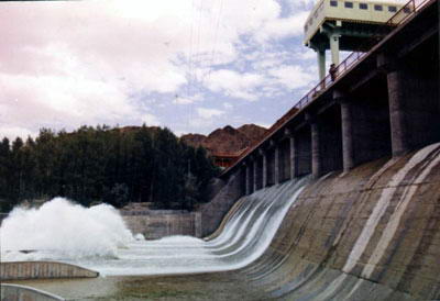 金塔鸳鸯湖水库溢洪道,有11孔堰上闸门,总宽100米,净宽76米,堰顶高程1318.00米,在汛期泄洪时,波涛汹涌,水声轰鸣,浪花飞溅,飞瀑流彩,恰似银河落九天,景色壮观。溢洪道两侧是金塔鸳鸯湖水库大坝,它是我国用现代科学技术建造的第一座土石坝水库,是中国水坝工程建设的里程碑。金塔鸳鸯湖水域面积14平方公里,坐船绕过夹山峡谷就能领略到“高峡平湖”之美景。金塔鸳鸯湖水库除险加固纪念碑亭于2001年修建,碑亭正面的浮雕,形象地反映了鸳鸯池的初始修建、历次加固及扩建的过程,由手拉肩扛人力车,到铁锹、牲畜车,最后到挖掘机、汽车机械化,碑正面刻鸳鸯池水库名,全面反映了鸳鸯池水库建设的历史过程。
