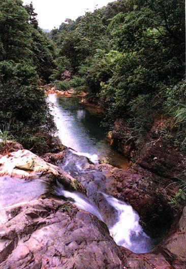 银坑溪发源于南海最高峰海拔540米的凹顶,清澈的山水随涧飞泻,沿途形成多处形态各异的流泉飞瀑和碧池深潭。由茶山深处的涓涓泉水汇流成银坑溪,流泉飞瀑,终年不息,然降雨之后更飞珠溅玉,峡谷雷鸣,精灵而有气势。银坑溪一直在石上、石间流淌,翻云泻玉,如鸣环佩,溯流而上,但见迹近于雕塑的石头,或躺在水,或立于山,栩栩如生,极具神韵。因山势跌宕而形成的大大小小的瀑流更是千姿百态,层层迭落。而瀑流之下的清潭各具特色,有的深不可测,碧玉温宛如玉,有的清澈如明镜,如掬水在手,一洗尘颜之间,还能领略“鱼翔浅底、落英缤纷”的意境。溪边一路的竹林花树,繁茂多姿,意韵悠深。