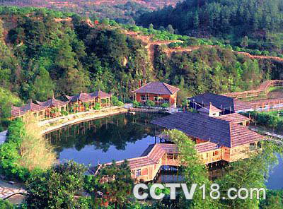 谷丰园的山间建有豪华的山庄别墅和别致的松林小屋,拉开窗帘,整幅的落地窗挂着一绝美的画——名字叫自然。跃入门前椭圆形的泳池,青山环抱着你,白云在头上悠闲地晃荡,小鸟的歌声在耳边缠绕,游客的心也渐如天空般明净。累了,换上休闲的衣服,或茗茶,或垂钓,或泛舟湖上,可以什么都想,也可以什么都不想。