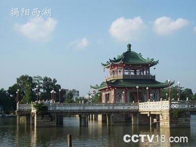 揭阳榕江西湖位于市区中部,南河北侧,是1058年的筑堤围造起来的一处以水域为主的风景区。目前,有大小湖塘20多个,连成300多亩的宽阔水面。有九曲石桥横架湖中,中置双层瑚心亭,古色古香,颇有江南园林意趣。环湖垂柳,摇绿曳碧,拨云弄月,十分雅致。红墙黄瓦,掩映于丛林之中;虫唱鸟鸣,四时不断。游艇往来,清歌婉转。为粤东一大名胜。