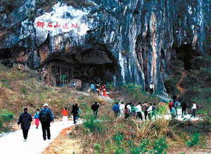 牛栏洞位于广东省英德市云岭镇东南面约2公里的狮子山南麓,东经113°27’10″,北纬24°20′34″。狮子山是一座石灰岩孤峰,相对高度约100米,周围是石灰岩地区的蚀余丘陵山地。狮子山下南侧有一条宽约25米的古河道经过,向东南2公里处注入北江。牛栏洞是因当地村民在洞中圈牛而得名。洞内主要为廊道型发育,但较深处洞顶有落水洞使局部呈裂隙型发育。全洞平面略呈曲尺形,洞口在东端,方向138°,宽2.5米,距山下地表约11米,因洞壁崩落石块,使洞口仅可容一人进出。从洞口内进为斜坡式向下,至约10米处以后呈缓平状,洞口向西延伸共长约25米(东洞),然后向北拐弯延伸至尽头约有20米(北洞),拐弯处向南也有一小段(南支洞),长约4米,尽处被今人炸通而形成略宽的洞口。洞内高5米~15米,宽2.5米~5米,总面积约400平方米。