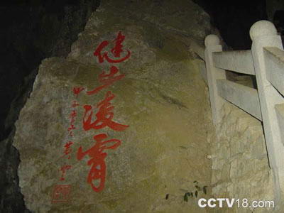 凌霄岩高100米,长宽各200米,游览面积4万平方米,分三层游览,即底层为凌霄大厅、中层为凌霄殿、上层为观景台。凌霄岩被誉为“南国第一名胜”。凌霄岩洞口高46米,清风缭绕,气宇宏敞。经过小桥、古寺和曲桥,进入凌霄大厅了,这里有条地下河经过(河内可泛舟),天成一个沙滩。