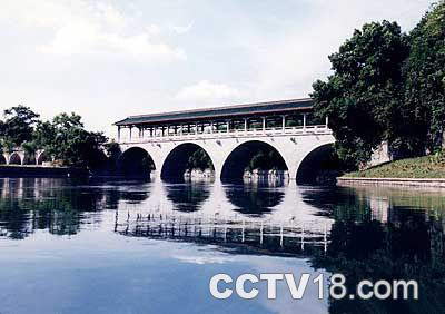 花桥横跨灵剑江与小东江的会流处,是七星公园西面的入口。它原名嘉熙桥,始建于宋代,明朝时重修两次,并在桥西增建旱桥七孔,用于汛期排洪。该桥在当时地处城郊,每年春夏,花开烂漫,落英缤纷,“满溪流水半溪花”,所以称之为花桥。现桥是1965年依原式重修的四孔桥,青石所砌,汉白玉栏杆,桥顶盖有琉璃瓦,可供游人避雨观景。远眺花桥,桥孔与倒影,就像四轮明月,映入江中。桥上赏景,可见水光山色,绮丽幽雅。“四轮明月伴芙蓉,半入澄江半化虹。花好月圆情缱淃,长亭恰似广寒宫。”这首诗写的就是“花桥映月”之景。