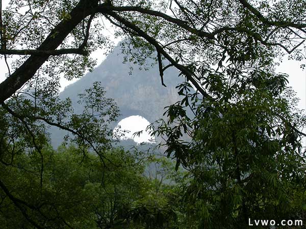 月亮山位于高田,距离阳朔8公里,这里的风光古朴素雅、恬静安逸。山头上有一个天然的大石拱,两面贯通,远看酷似天上明月高挂。从不同的角度变换观看,此洞形状也不断变化。如果是开着车赏月山,那个石拱的形状会从弯弯的上弦月,逐渐变成半月、圆月,继而又变成下弦月,十分奇妙。