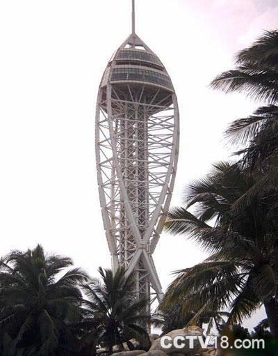 当然,园内最耀眼的主体建筑还得数“千年塔”,为纪念新千年的到来,投资商共斥资3000多万元建造了这座纯钢结构、银色仿鱼型的观光塔。塔高达131.101米。内设两部观光电梯,直达76.8米高的观光平台,并伴有空中花园。该塔已载入吉尼斯世界纪录。夜间在景观灯的照耀下,千年塔更加夺目、耀眼,她已成为海南省的标志建筑。游人若置身于观景平台,如遇晴天,可放眼望到数十海里外的海天景色。