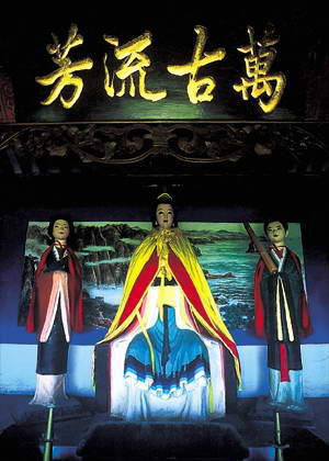 进入大殿,前殿正中塑孟姜女像,旁有男女二小童,身背罗伞。孟姜女像泥塑彩绘,身披青衫素服,面带愁容,遥望南海。像上悬横额“万古流芳”,两柱对联是:“秦皇安在哉万里长城筑怨;姜女未亡也千秋片石铭贞。”相传这副楹联为南宋末年伟大的民族英雄、爱国诗人文天祥所作。