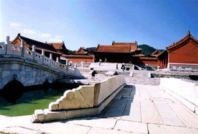 三、陵寝门前的玉带河上建有三座规制相同的一孔拱桥,龙凤柱头栏杆,桥两端以靠山龙戗住望柱。这三座拱桥造刑优美,雕工精细,在清陵中仅此一例。