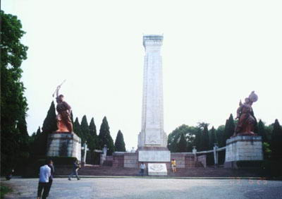 穿过绿瓦红檐的高大牌坊,迎面而来的是高25.7米的纪念碑,巍然耸立的黄麻起义和鄂豫皖苏区革命烈士纪念碑上,镌刻着叶剑英、徐向前、李先念等的题词,碑座正面塑有五星碑徽,台座正中为汉白玉雕成的花环,左右分嵌有再现黄麻起义和苏区军民坚持武装斗争、保卫苏维埃政权的浮雕,碑座前刻有中共湖北省委和省政府撰写的碑文。纪念碑前两旁的雕像群形象逼真,气势磅礴。左边塑的是一位武装农民身背大刀,高举铜锣,象征着黄麻起义。右边塑的是红军战士高擎钢枪,奋勇向前,象征着根据地军民坚持武装斗争。