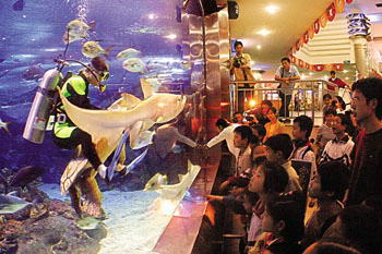 博大深邃的海洋无时无刻不在演绎着气象万千的生命故事。海洋的那份神秘莫测,那份绚丽多姿深深吸引着人类。而人于海洋的和睦相处,是地球生命形式多样化的美好体现。海洋馆内有逾千种上万尾来自世界各地的名贵海洋生物和淡水鱼,那乖巧可爱的海豹、英武骠悍的大鲨鱼、五颜六色的珊瑚礁、千姿百态的海草和神秘的水下奇观,让您饱览海底迷人风光。还有海豹和潜水员喂鱼的定时表演,定会让您惊喜有加,留连忘返。