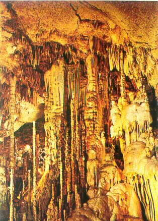 洞内岩石千奇百怪。石笋,簇簇拥拥,或圆或尖。有的像米粑,散落一地,有的像苞谷,籽粒毕显;有的像铁塔,四平八稳;有的像钢枪,宁折不弯。石柱,有的粗犷如铁路桥墩,顶天立地;有的瘦长似密林杉条,亭亭俏立。钟乳石,冰凝玉塑,鬼斧神工。有珊瑚,不见海水。有木鱼,却无僧人。有猪肝牛肚,铁锅岂可煮烂?有山精水怪,大圣哪能降伏?有冰条倒挂屋檐,愈挂愈长。有奇花怒放,越开越艳。还有石瀑、石帘、石龙、石马,五彩缤纷。让你赞声不绝,叹为观止。