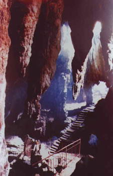 从“长城内外”走出,又一个神奇的宫殿展现在人的眼前,这就是主溶洞一水神洞。水神殿里,长长的洞道,一忽儿奇险,一忽儿平缓,峰回路转,景象万千。洞底下,清澈亮丽的水神河。在“哗哗哗—”有节奏地流淌。“山重水复疑无路,柳暗花明又一村”,仿佛走进了一个神话般的世界。步过石板桥,一个个晶莹剔透的乳石或悬挂在高高的洞顶,或紧傍于陡峭的洞壁,或挺立于崎岖的洞路……一个垂吊的钟乳石,引下一泓泉水,这水清纯甜蜜,常年不断。踏着一上一下的坎坷石路,行至“群芳观”,首先闯人眼帘的是两个隔坡眺望的石人,一窈窕,一英武,神形兼备,颇似鹊桥相会的牛朗织女。再缓步而下,到“八音洞”,里面垂吊的几柱钟乳石,经敲击会发出七、八种不同的音律。其响声悠远悦耳、醉人心脾。与“八音洞”毗邻的“情侣阁”更是一处世外桃源。小洞约10平方米,精致、清静,充满了浪漫的情调,立于小洞中,恍若置身于影剧院的包厢里和新郎新娘在洞房中……
