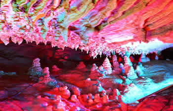 石奇,洞中怪石罗列,奇岩相叠,一石多色,五彩缤纷。石鼓、石笋、石凳、石人点缀其间,或横或竖,光怪陆离。