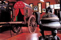 进馆便是一块大型九龙红木地屏《祝寿图》,地屏宽3米,高2.8米,重1.2吨,由1立方米上等老红木精雕而成。地屏中间24K金箔镶嵌的寿字由清.著名书法家,光绪皇帝老师翁同和书手书,地屏祝寿人物“百忠图”,为明,洪武年间银杏木雕。地屏背面饰物有西汉铜镜,北宋越窑花插,清乾隆年间云石,明.黄道周竹刻字联等珍贵文物。