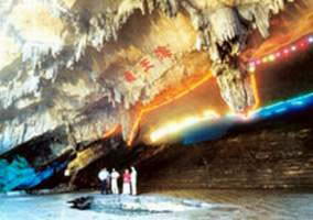 继而又到地道洞,洞内高起伏,时而弯腰低头,时而侧身前进。中心岩顶有一幅象棋盘,故又叫棋盘洞。洞中复有洞中洞。洞中洞在海王厅右侧。盘上旋下,左曲右弯,仿佛九曲回肠,又名盘肠洞。过了狭窄的羊肠小道,抬头远看,一缕自然光反射进洞内,叫“一线曙光”。
