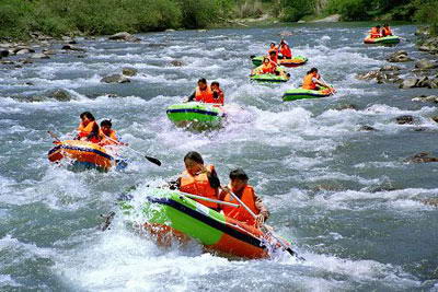 带上亲密的爱人,抱上心爱的孩子,陪同健壮的父母,乘上橡皮舟,只要你操起双桨,左右逢源,定可安然漂流而下,来一个全家漂更是妙不可言。一路漂来,人生的所有情味就都在这其中了。而逞能的姑娘在过滩时如被飞溅的浪花吓得掉入水中,即刻就会有健壮的手臂向她伸来——当然这并不排除同舟的小伙子恶作剧,创造“英雄救美”机会的可能。其实遇到此种情形即使落下河喝上几口水也并非坏事,当自己挣扎着站稳脚跟就会发现河水正悄悄地从大腿间流过,瞧那水要多清有多清要多纯净有多纯净,绝无任何污染。何况还会从虚惊中多了一分体验一分得意,难怪有人戏称“不到浪中翻个滚,哪知河水是甜泉”。谁要有兴趣就停船登岸,露宿沙洲,入夜后伴以流水蛙鸣,举杯同邀清风明月,享大自然宽厚、质朴、醇美的恩赐。这对于饱受城市喧嚣和环境污染之苦的人来说,简直是一方仙境。