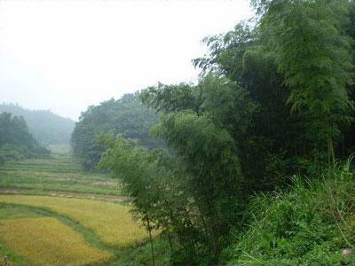 由梅花山庄西行约两华里,有一个被大山包裹着的小水库,一路上遍见山溪响泉。立于水库坝上,让人感觉到似乎融入了大山的绿之中,看到的是绿的颜色,听到的是绿的声音,嗅到的是绿的味道,感受到的是绿的灵气。再往西行几十米,是一个被翠竹簇拥的、只有几户人家的小山村,一色的土墙屋,周围是竹山、树林、稻田、莲塘,田野里几头黄牛正悠闲地吃着草,农舍旁边躺两只懒洋洋的黑狗,一群母鸡在一只公鸡的带领下勤奋地刨着食。一切都是那么地安静、和谐,有如牧歌般的美丽。我们沉浸于其间,尽情地享受难得的乡情,用心努力地感受那自然天成的乐趣。