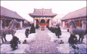 关帝庙位于海城市内,为省级重点文物保护单位,始建于清代康熙二十一年(1682年),后经来海的山西商人捐资修缮,作为山西会馆。前殿是悬山式建筑,砖木结构,面阔三间,进深一间。前有抱厦,有转角、补间双重昂五铺作斗拱,昂嘴雕云纹。青石鼓形柱础,柱和横额之间嵌木雕龙凤云板,施彩绘。后门有小卷棚,有转角、补间单昂三铺作斗拱,柱额之间嵌木雕花卉板。后门两旁各开六角菱形小窗一个。