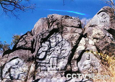 道光八年(1828年),来自西藏普安寺四世活佛丹毕道尔吉,利用海棠山的天然岩石崖壁主持镌刻摩崖造像,其文字有蒙、藏、满、汉四种,50余处,在国内罕见。内容为咒文、真言、赞语、镌刻时间、记事、施主和雕刻工匠姓氏。佛教人物造像有:阿底峡、宗喀巴、贾曹杰、克珠杰、米拉日巴、关圣大帝,普安寺位显、德高、权重的活佛和经师。神佛造像主要有:释迦牟尼、阿弥陀佛、无量寿佛、药师佛、观音、文殊、度母等佛母和金刚、护法神造像,共46种190尊。在雕刻方法上吸取了中国古代及国外雕刻艺术风格,造像雕刻得细纤精巧,惟妙惟肖,从形式上看生动活泼,神形兼备,富有美感,形成了海棠山独特的具有蒙、藏、汉族兼备的高、中低浮雕艺术特色。至今有些造像的彩绘仍很鲜艳,令人叫绝。目前,在我国发现如此规模的摩崖造像还尚属首次,海棠山摩崖造像堪称中国一绝。