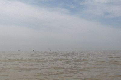 黄龙入海是指黄河入海。经过5464公里的奔波,黄河入海时已显得坦荡而平静。放眼望去,河岸上茫茫的荒原与河水融合在一起,在蓝色的晴空下闪着金色的色泽,若乘飞机鸟瞰,海河交汇处是一条黄蓝分明的的水位线恰似两匹绚丽的绸缎,在此打上一个同心结,系在黄河三角洲的颈项上。进入汛期,河水涌浪滚滚,涛声阵阵。天水一色,气势磅礴,如一条黄龙,咆哮着向大海冲刺。