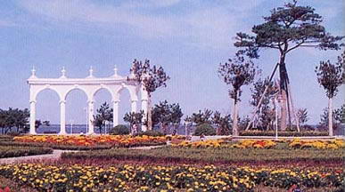海上公园定位于海上文化、生态观光、旅游度假三大功能,立足于建精品、创一流,规划设计博采国内外众家所长,集思广益,中西合璧,走出了一条独具特色的自我设计、开发之路,形成了格调鲜明的绿化风格。游乐园区北部绿草如茵、鲜花绽放,小径迂回,群鹿追逐,一派田园风光;中部欧式风格的创业门造型别致,气势宏伟,成为开发区人艰苦奋斗、开拓进取的精神象征;南部湖区拱桥流水,湖波荡漾,游人垂钓,让人疑心置身江南水乡。