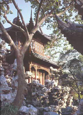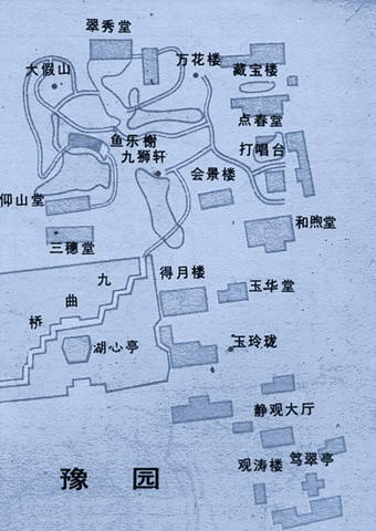 豫园曾被誉为奇秀甲于东南,最早为明代造园高手张南阳设计,是一座揉和了我国明、清两代园林艺术的名园,被国务院定为全国文物保护单位。一进园门,迎面的建筑是三穗堂,抬头仰望,“城市山林”的四字匾额,形象的反映了豫园所处的环境:周围是喧闹繁华的都市,园内则充满了山林野趣。穿过仰山堂,一座大假山隔池相望。山高12米左右,是用2000吨武康黄石堆叠而成,迂回曲折,气势磅礴。豫园的围墙,蜿蜒起伏,顶上饰以龙头,并用瓦片组成麟状,象征龙身,一垛墙如居龙游动,称为龙墙。在我国古代,龙是封建帝王的象征,是不能随便用在建筑物上作装饰的。豫园在建龙墙时已是清末,而且“龙”只有三,四个爪子,是为了避去“五爪金龙”之嫌。这两条龙,龙头相对,中间有一颗珠,被称为“二龙抢珠”。豫园内园系清康熙四十八年(公元1709年)建,占地面积仅2亩许,但山石池沼、大厅堂室、亭轩楼台一应俱全,花墙小廊,布置得宜,益使小园曲折迂回,疏密有致。内园还新建有古戏台一座,俗称"打唱台",也叫"凤舞鸾吟"。戏台依山临水,半跨池上,建筑精致,藻饰华丽。尤其是台前的垂檐,雕刻细腻,涂金染彩,工丽精巧,金碧辉煌。戏台四面的石柱上,分别有描绘春夏秋冬四季景色的对联。正中央悬挂着郭沫若同志1961年游览豫园时写下的诗篇"小刀会址忆陈刘,一片红巾起海陬。日月金钱昭日月,风流人物领风流。玲珑玉垒千钧重,曲折楼台万姓游。坐使湖山增彩色,豫园有史足千秋。"