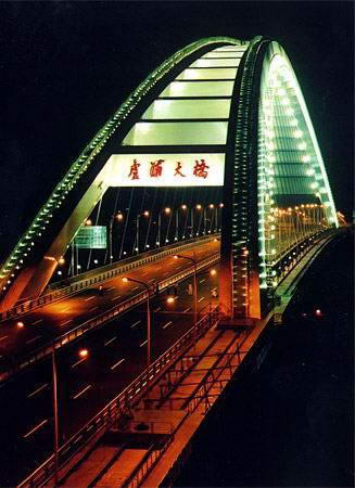 上海卢浦大桥是当今世界第一钢结构拱桥,是世界上跨度最大的拱形桥。550米的跨度比排名第二的美国西弗吉尼亚大桥长出32米。是世界上首座采用箱形拱结构的特大型拱桥,主拱截面世界最大,为9米高,5米宽,桥下可通过7万吨级的轮船。它也是世界上首座完全采用焊接工艺连接的大型拱桥(除合拢接口采用栓接外),现场焊接焊缝总长度达4万多米,接近上海市内环高架路的总长度。