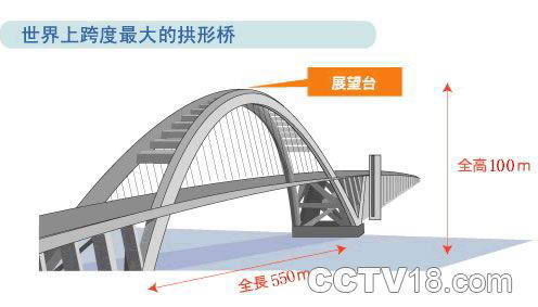 1、世界上跨径最大的拱形桥,跨度为550米,跨度比目前世界最大的美国西弗吉尼亚大桥还长32米。