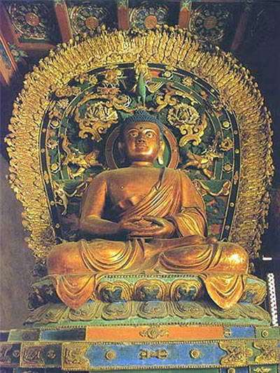 台怀镇南清水河西侧就是镇海寺,距台怀镇10里,海拔1600米。寺院坐落在“二龙戏珠”的风水宝地,左右两侧环绕的山峰,犹如两条飞龙落下河谷,拱背弯腰,腾挪围抱;寺院建筑在两山合抱的一个石山嘴上,宛若一颗二龙嬉戏的宝珠。山豁口有苍老挺拔的大松树,走在松树林间的蹊径,再听飒飒的松风,给人一促静寞幽深的感觉。入寺四望,南侧的山峰,长满密密麻麻的杉树和杨树,北侧的山巅上,千年古松出于岩石之中。这里是五台山的一处风景区,浓荫苍翠的古松掩映山寺,在五台寺庙区还是少见的。