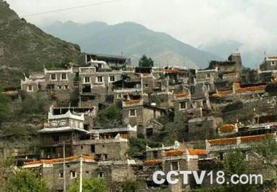 甘堡藏寨像一群群石雕坐落在半山腰中。杂谷脑河从寨前奔腾而过。进到寨子,首先映入眼底的是一幢幢石头垒砌而成的碉楼般的屋楼。石屋不用砖、水泥、河沙、石灰。它是就地取材于河水中顺水冲下的似花岗石般的麻子石切割加工成大小不一的块状,用当地的粘土垒砌而成。石屋冬暖夏凉、不易风化,又防震、防火、防水。石屋一般两三层楼,下宽上窄:一层养牲畜,堆杂物;二层是客厅、厨房、寝室、客房;三层屋顶平整可作晾晒,扬打粮食。有的藏居甚至还有类似现代楼房中内、外阳台式的建筑。石屋毗邻相连,高低错落有致。自然排列成村落;屋与屋间留有狭窄的巷道,宽则三米左右,窄的仅能并肩过两人。巷道路面全由麻子石砌成,全寨大小巷道有多少,当地老人们也说不清。
