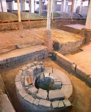 水井坊原是成都全兴酒厂位于锦江区水井街的酿酒车间,因改造偶然发现了埋藏在地下、历经元明清600年的古代酿酒作坊遗址。水井坊遗址面积近2000平方米,发掘的遗迹包括晾堂3座、酒窖8口、炉灶4座、灰坑4个及路基、木柱、酿酒设备基座等,同时还出土了大量土陶和瓷器,包括碗、盘、钵、盆、杯、碟、勺、罐、壶、缸、砖等,以酒具最为丰富。
