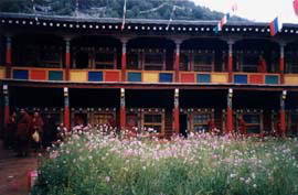 萨迦派更庆寺位于德格县城(更庆镇)文化街东端,于明正统十三年(1448)由德格家族第三十六代博塔·扎西生根和西藏香巴噶举名僧唐东杰波主持首建了位于司根龙的经堂,以唐东杰波名字取名为"汤甲经堂"。明末清初,第六代德格土司嘎马松执政期间,不惜花费大量人力、物力,开始兴建规模庞大的更庆寺主寺。历经第七代土司向巴彭错至第八代土司根嘎彭错执政期间,更庆寺工程才算基本完工。清雍正年间,第十二代德格土司登巴泽仁又大兴土木,费时数十年,在更庆寺主殿的西侧建起气势恢弘;名闻藏区的德格印经院并将其交与更庆寺僧侣经营管理。至此,形成了更庆寺沿欧曲逶迤而下,东有主寺与僧房鳞次相间,西有印经院和汤甲经堂,占地数百亩的大型建筑群。