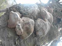 在桫椤峡谷谷首的一侧,有一奇异的崖壁,宽约1000米,高约100米,灰白色,似一堵墙陡 立于峡谷。在崖壁的中心位置,有一口约1?1米见方的石洞。顺着崖壁垂下的藤条攀援而上,可进洞里。洞深4?5米,高2米,宽3米,非常干燥干净,似有石凳、石桌等人居痕迹。有人 在风雨雷电之夜,看见洞口两侧的崖壁上两只灵芝闪闪发光,因此这段崖壁被称作“灵芝崖”。笔者探访谷内,看见靠灵芝崖的一侧桫椤长得十分茂盛,而另一侧却不长桫椤。灵芝崖 所处的峡谷口有“落音沱”,每当大雨来临之前,就见白雾升腾,阳光映照下,升起一道彩 虹。据说,整个峡谷就这里的氧含量和负离子含量最高。