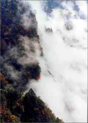 灵岩地处峨眉金顶三峰的后山麓。在灵岩寺遗址上,向北眺望,迎面便是一幅万山重叠的天然图画。近处,青峰绵延起伏,茂林修竹,点缀其间;远处,万佛顶、千佛顶、金顶宛似座巨型翠屏横亘天际,气象雄伟,三峰挺拔而柔和的轮廓线十分清晰。重重叠叠的波峰,由低至高,由近至远,青青的山色由翠绿到黛青,到灰蓝,到灰白,层层深远开去,一直延伸到与蓝天的分界线,层次极为丰富,正如谭钟岳在另一首诗中写的:“灵岩翠秀耸高台,遥望天门跌荡开。”金顶三峰的景色多彩多变。初春时,山麓盛开一片黄灿灿的油菜花,春意荡漾;山腰密叶繁枝,如正当盛夏;半山上片片泛黄的树叶,似带秋色;山顶却堆砌残雪,又象尚处在严冬的寒凉里。从山下观望峨峰三顶,有几处绝好的地方:在山东麓的连香坝,在低山的会灯寺,在中山的白龙洞古德林;但皆不如在灵岩遗址那样逼近、开阔,可从更深的层次上静观峨眉山另一美妙、奇幻的侧影,欣赏“叠”刚与柔、壮与秀相依互存的美,因而神思飘荡。明人章寓之的《游灵岩寺》道出这种心态:灵岩一径入青苍,雨后昙华隔水香。方外欲偷闲半日,绕廊翻觉觅诗忙。