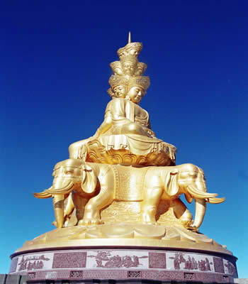 峨眉山金顶四面十方普贤金像是世界上最高的金佛,也是第一个十方普贤的艺术造型。金佛系铜铸镏金工艺佛像造像,通高48米,总重量达660吨,由台座和十方普贤像组成。其中,台座高6米,长宽各27米,四面刻有普贤的十种广大行愿,外部采用花岗石浮雕装饰,十方普贤像高42米,重350吨,中个金佛设计完美,工艺流畅,堪称铜铸巨佛的旷世之作,颇具几高的文化价值和观赏审美价值,是海峡两岸艺术家心灵的碰撞,智慧的结晶。