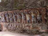 牛仙寺摩崖造像的总体造像规模比千佛岩小,造像的年代、场景、人物、内容基本与千佛岩相同。全部龛形以正方形、长方形平顶为主,个别为塔亭形。位于北面崖壁的造像与千佛岩差异的是多数人物造像略小些,另外使人注目的是许多龛框上刻有花边浮雕装饰,雕刻的线条流畅、显得十分优美。位于南面另一山崖的造像,较为宏观,有一窟当地人称呼为“大堂屋”的造像,凿刻在高约十多米的悬崖上,龛形略显长方形,高约2米多,宽约2米,深度约1。5米。雕刻的佛像排列有序、层次分明、大小均匀,里面三方密集,数不胜数。在旁边不远处有一塔亭形造像。其总高度达2。5米左右,涂有色彩,基调为白,人物形态为跏趺式,高约1。2米,可能为观音造像。此处的造像内容有净土变、三世佛、千手观音、天龙八部、一佛二菩萨等。