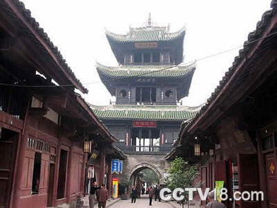 “三面江光抱城郭,四围山势锁烟霞”,宋朝诗人李献卿的《南楼》诗写出了江山之会的胜景。华光楼是阆中的标志性建筑,根基稳固,文化积淀深厚。它横跨大东街南头,位于上、下华街之间,临嘉陵江,正对南津关古渡。是一座过街门楼,三重檐,歇山式盔状屋顶,盖翠绿色琉璃瓦,脊饰相当繁复,重脊套人、兽、鸱吻,正脊宝珠形顶高达三米,楼身通高三十六米,四柱直木,全系木结构,各层装花窗,十二个飞檐凌空,宝顶摩云。内有梯可以层层攀沿,四周游廊挺出供人凭栏,更有诗文匾额供人赏叹。