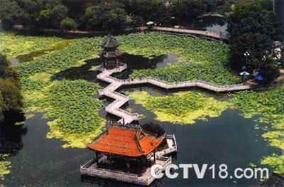 西湖湖光亭与红蕖榭在满池碧荷中遥相呼应,桥与亭为伴,水同榭相依