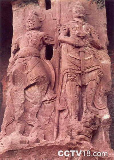 造像题材以道教为主,兼刻有佛、道合龛造像,也有少数佛教造像,保存完好。主要造像有老君、释迦和老君并坐、真人、十二时神、金刚力士、九头鸟、观音、势至等。其造像错落有致,优美生动。其中最大的一龛是老君造像龛,始凿于唐开元18年。龛窟呈双叠室型,方口,高.3.6米,宽3.4米,深1米。龛内正壁雕凿主像老君,它趺坐于三层仰莲瓣莲台上,其下是一层覆莲瓣的莲台,再下是八棱座基。老君面部丰满圆润,两眼平视,头戴莲花冠,结胡须,身着高宽领道袍,胸前有一张三足凭几,左手放几上,右手执宝扇,头后有莲瓣形背光。其左右侍立金童、玉女,均头戴莲花冠,身着交领宽袖道袍。左像双手执笏,右像双手合十,赤足立于莲台之上。龛窟的左右壁上,各刻一女真人,其身躯高于金童、玉女。龛窟左右壁与正壁上部对称刻护法神,合为十二时神。老君脚下外沿刻有蹲狮和12尊小造像,其项均有背光。龛外刻一真人像,身着交领大衫,外罩半臂袍,手捧玉章,站立于莲台上。左边立一束发神将,深目阔嘴,身着甲胄,右手举剑,护腿至膝盖,脚穿长统靴。龛窟下部站立十二神将,穿戴近似十二时神。