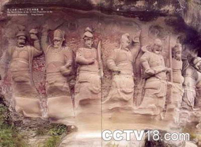 此处现存摩崖造像63躯。单个造像34躯。另有明、清碑刻题记29处。造像总长达350米,气势宏伟,石像高大,其中高5-7米8躯,1-4米的50躯,均雕刻有造像,或佛祖,或菩萨、金刚、力士。佛祖、菩萨多为慈眉善目,神态安祥,宝冠装饰无一雷同。金刚、力士多龇牙咧嘴,钉杀气腾腾。观音菩萨、大势至菩萨和文殊师利菩萨高5-8米。观音菩萨左手前伸,平托纱巾;大势至菩萨左手内曲置于胸前,五指并拢平托厚厚的经卷;文殊师利菩萨左手托经书外伸1.5米,书和手的重量上千斤,历经千年不毁,全靠高2.2米的垂地袈裟支撑,运用力学与美学结合,造型十分巧妙。