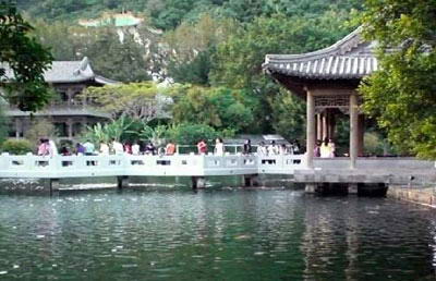 至善园^至德园入口步径沿溪而筑,回廊曲桥跨溪兴建,游人可从桥上享受凭栏赏鱼之乐;循步径来到龙池,垂柳依依、杜鹃争艳,缕缕水柱由龙首喷出;池中锦鲤集聚,而黑天鹅、白天鹅成对悠游,优雅的姿态令人爱怜。松风阁、碧桥西,隔着龙池斜斜相对。松风阁是幢精致的二层楼亭阁,据说以宋代诗人黄山谷的松风阁诗为蓝本设计,采用上选云杉架构,梁柱四周环绕着龙凤雕饰;登临二楼,湖光园景尽入眼帘,逢假日还有古筝现场演奏;而碧桥西则为一大型亭台,有曲桥可达湖心。