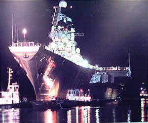 通过登舰梯,走进五甲登舰大厅。航空母舰的空间排列是甲板向下依次排列,甲板称一甲,向下一层为二甲;舰岛第一层为一甲,向上一层为01甲,类推。基辅号航母全场273.1米,型深21.6米,排水量40500吨,自重2.3万吨,全舰17层。搭载12架战斗机,21架直升机,载士兵1200名。飞行甲板在基辅航母左半部,长200米,宽30米,整个甲板有3个足球场大小。甲板后方有长方形升降口,下方是一个约3000平方米的机库,甲板上有6个飞机起降位置。航母右半部是一艘导弹巡洋舰的模型,装备着对空对海攻击的各式武器,交错布置了4座仿真SSN-12型远程舰对舰导弹,弹仓有10米长,16枚仿真导弹编成2组。航母的前甲板上,有2座双联装对空导弹发射架,2架反潜深水炸弹发射架,一座双联装76毫米口径火炮,一座井式对空弹导发射架。航母的舰桥与桅杆有十几层楼高,它的前部几层舱室是航母的指挥中心,编队司令、舰长在此发号施令。舰内有鱼雷发射舱、鱼雷、深水炸弹显示控制台、反舰、反潜导弹控制台、飞机起落指挥控制台、三甲对空导弹舱、反潜导弹舱、二甲对空导弹舱等现代军备。