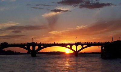 伊犁河大桥是伊犁第一座现代化桥梁,建于1975年。大桥位于伊宁市城南5km的伊犁河上,桥下水流湍急,河边树木茂密,桥北岸为伊宁市区,桥南岸10km处则为察布查尔锡伯族自治县的县城。伊犁河大桥的桥型属钢筋混凝土双曲拱桥,下部为钢筋混凝土高桩承台,并特设有钢板破冰体,以防春季融冰时,巨大冰块对桥梁的冲击。全桥共九孔,远眺九个拱孔加九张巨吃支撑着笔直的桥面凌空跨越天堑,显得异常雄伟壮观。