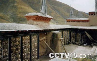 整个天葬台院子约有4000多平方米,四周有约一人高的土墙,在南墙和西墙上修有木架,约四五格,每格内都整齐地排列着一个个人头骨,形成两面长长的骷髅墙,一个个威严的骷髅头骨,让人感到神圣的威慑和由衷地惊叹。