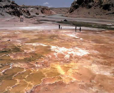 从清水河谷上溯数百米就可以看到温泉边有数十座泉华堆、泉华柱和泉华台阶。泉华在太阳照射下,发出刺眼的银光,千姿百态,十分壮丽。泉华石林上最值得观赏的喷珠溅玉的水花,凝结成晶莹透明的各种栩栩如生的小动物,如饮水的猛狮,司晨的雄鸡,擎天的玉柱,荒原的古堡。泉华周围有十多个泉眼,泉水有如串串珍珠从深绿的池窝里汩汩流出。这里每个泉眼的形状都是不同的,有的圆,有的扁,有的大,有的小,有的两三个出现在同一个钟乳石堆上,高低错落有致;有的就一个泉眼,间歇性地往外溢水。他们的水质虽然都同样清澈透明,但水底的沉积物却各不相同。有的呈碧绿色,有的粉红,有的浅黄,有的乳白………最大一处呈圆形约30平方米,水温50℃,数丈高的石柱旁有个天然浴场,数不清的泉眼“咕咕”地往外冒着水。浴场旁边,千百年来形成的钟乳石堆积如山。中间或是边上不是可以发现泉眼,有的有泉水溢出,有的只闻水声不见泉影。在浴场靠里的山脚下,有两个碎石堆成的经塔,你会看到经幡在水面上摇曳。此温泉,对此美景,如入神仙瑶池境界。