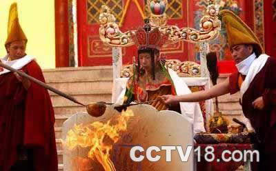 新宫为1954年兴建,是班视野大师安寝的夏宫。第一道大门前檐有4银八角朱漆大柱抵顶,门殿浮雕着凶悍的野兽,有腾跃欲飞的蟋龙,还有各种花卉图案。门壁两侧,彩绘着卷云、猛虎、长龙、人物、繁花、蔓草以及佛教故事壁画,笔法细腻,形神毕肖。入二门是新宫的前庭四合院,迎面是富丽堂皇、庄严肃穆的新宫。