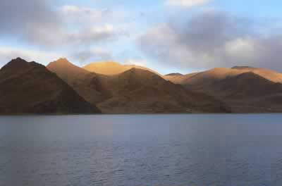 羊卓雍错,藏语意为“天鹅池”,是西藏三大圣湖之一,湖面海拔4441米,东西长130千米,南北宽70千米,湖岸线总长250千米,总面积638平方千米,湖水均深20-40米,是喜马拉雅山北麓最大的内陆湖。羊湖汊口较多,像珊瑚枝一样,因此它在藏语中又被称为“上面的珊瑚湖”。湖内分布有10余个小岛,大的可容五六户居住,小的则仅有百余平方米。羊湖属低浓度咸水湖,每年11月中旬开始封冻,冰厚可达0.5米。湖中盛产细鳞鱼、西藏裂尻鱼、高原裸鲤等,储量估计达2-3亿公斤,如今这里养殖业已形成较大规模,所产的鱼不仅供应拉萨市场还远往内地销售。这里还是藏南最大的水鸟栖息地,每逢冬季群鸟南徙至此,在湖岸及湖心岛一带,天鹅、水鸽、黄鸭、鱼鹰以及斑头雁都非常地多。从山口下到羊卓湖畔需要大约30分钟,然后可以一直沿着湖边的公路欣赏羊卓雍湖的景色。直到再开过60千米后接近浪卡子县的时候,这面美丽的镜子才会逐渐消失在你的视线之中。走这条路线,在过了浪卡子县城之后大约40千米时可以见到近在咫尺的宁金抗沙峰。