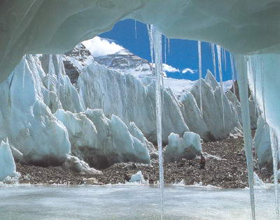 绒布冰川位于日喀则地区珠峰山脚的绒布寺前面300米处,海拔5500一6300米,末端海拔5154米。长2262公里,冰舌平均宽1.4公里,面积86.89平方公里。总储水量为160多亿立方米,是一座巨大的“固体水库”。常年悬挂着冰乳钟、冰桥、冰笋、冰幔、冰花。为复式山谷冰川。