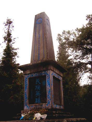 国殇墓园,建成于1945年7月7日,占地88亩,主体建筑以中轴对称,台阶递进形式,由大门经长通道循石级而上至第一台阶,再循古级而上,至嵌有蒋中正题李根源书之“碧血千秋”刻石的第二台阶档土墙,沿培分两侧上至第二台阶,建有庄严肃穆的忠烈祠。忠烈祠为重檐敬山式建筑,上檐下悬蒋中正题“河岳英灵”匾额,捐堂正门上悬国民党元老大书法家于右手书的“忠烈祠”匾额,祠内外立柱悬卦何应钦及远征军二十集团军军师将领的题联,走廊两侧有蒋中正签署的群护国殇墓园的“国民政府军事委员会布告”,二十集团军总司令何援章的“腾冲会战概要”,“忠烈祠碑”等碑记。