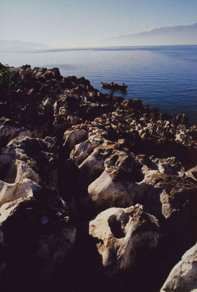 在岛上有一片“太湖石群落景区”。“太湖石”是一种珍贵的园林观赏石。因这种石头大都产于太湖而得名。一块好的太湖石价值不蜚,求之不易。而这个岛上的太湖石不仅种类繁多、姿态万千、怪异非常;而且规模宏大、成林成片、构成群落,蔚为壮观。