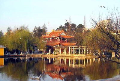 自明朝起的历任云南行政官员都曾在这里修亭建楼。由于垂柳和碧水构成其主要特色的缘故,本世纪初正式定名为翠湖。它以“翠堤春晓”而闻名四方。人们称之为“镶嵌在昆明城里的一颗绿宝石”。